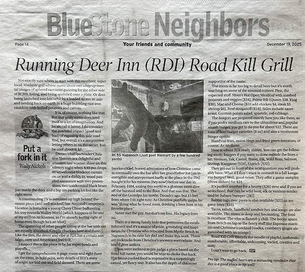 Not exactly sure where to start with this excellent, super local, roadside grill whose name alone can whip up mental images of splayed raccoons gunning for the other side of Rt. 209, losing, and being spatula'd onto a plate. Or deer being lunched into low orbit by a loaded 40 ton tri axle and landing back on earth in a huge bubbling cast iron cauldron with boiled potatoes and carrots.